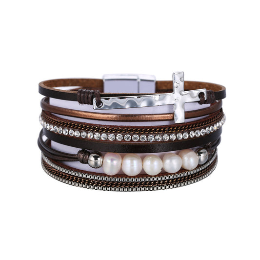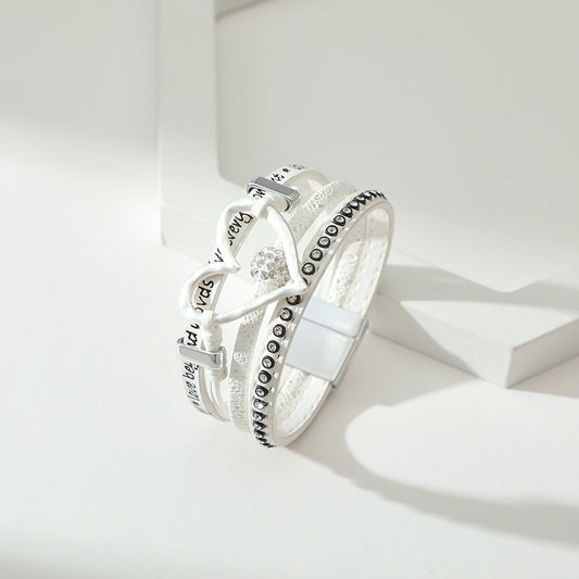 Sisslia Bohemian Crystal Rhinestone Beads Heart Shape Wrap Multi Layer Leather Cuff Bracelet Bangles With Magnetic Buckle