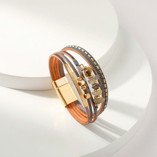 Sisslia New Leather Charm Bracelet Magnetic Clasp Stones Multi Layer Natural Stone Beaded Leather Clasp Bracelets