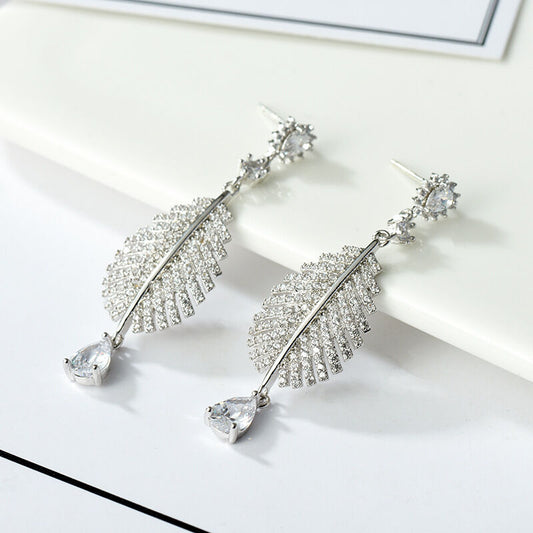 SISSLIA Graces Trendy Shiny Cubic Zirconia White Gold Color Long Leaf Crystal Drop Earrings Bridal Wedding Earrings for Women